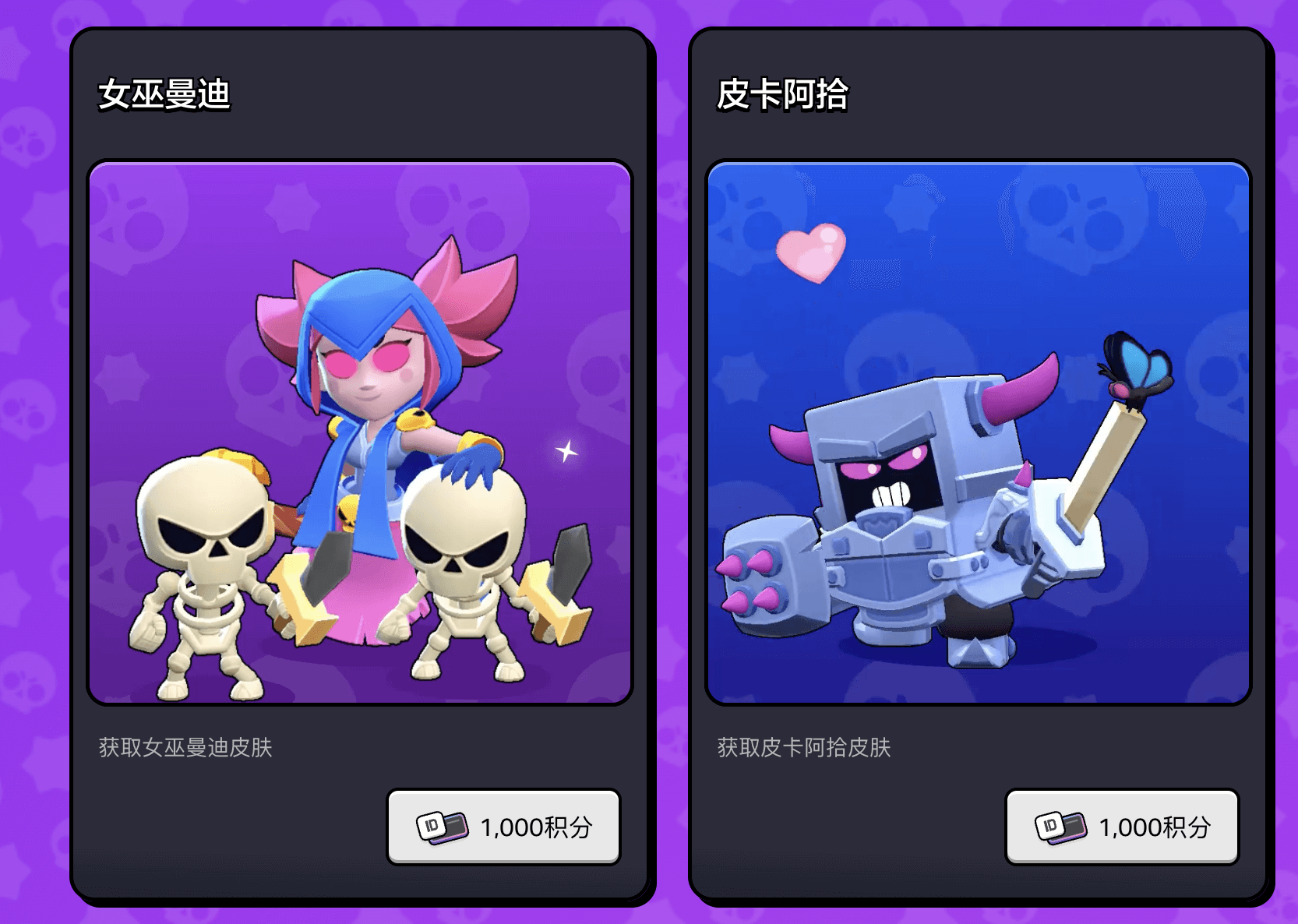 等待终于结束!“女巫曼迪” 和 “皮卡阿拾” 终于在 Supercell ID 奖励网站上架啦,每款售价 1000 积分。