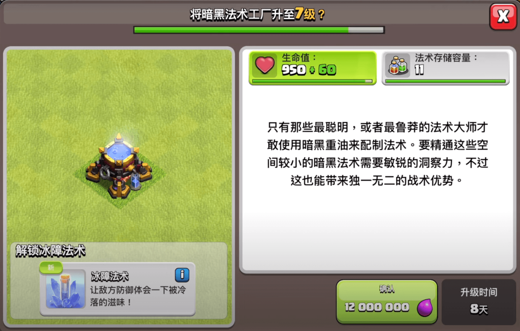 - 黑暗法术工厂所需等级:7级(14级大本营可以解锁)