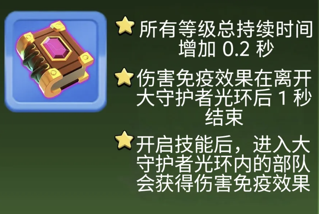 - 激活后,进入大守护者光环的单位现在也将获得伤害免疫效果。