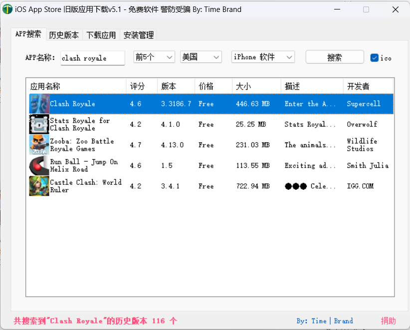 接下来在iTuens旧版本下载工具中搜索 Clash Royale,注意搜索框后的地区切换到美国,点击搜索,能看到搜索到了皇室战争。