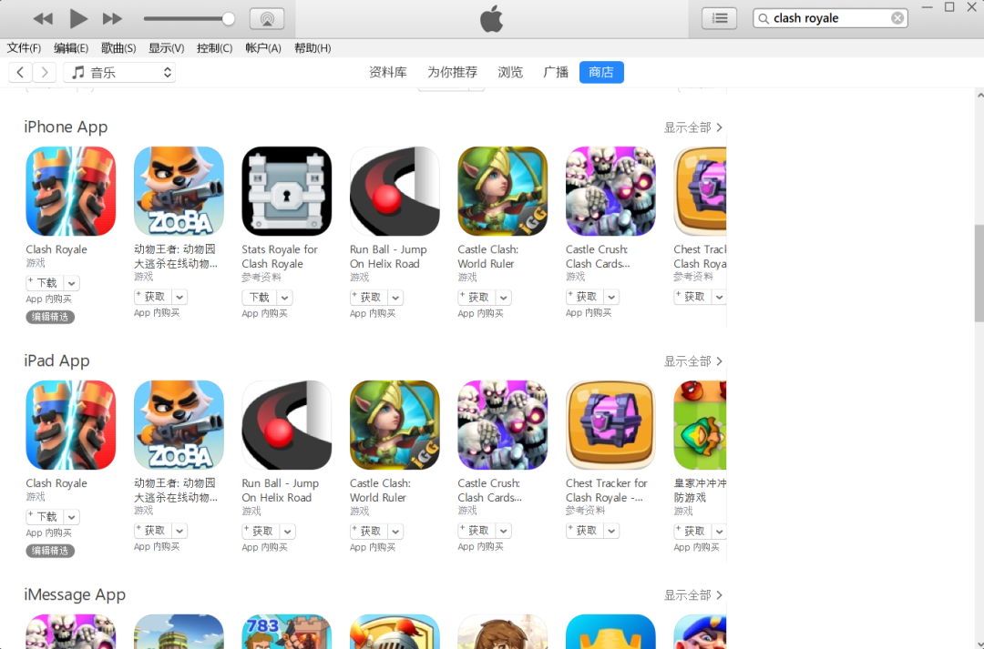 iTunes主界面,左上角切换成应用,然后右上角搜索 Clash Royale。