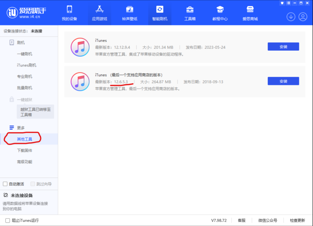 接下来进入爱思助手,点击最上面一排的智能刷机,然后点最左侧的其他工具,这是会有两个 iTunes,我们安装下面那个,12.6.5.3的版本。