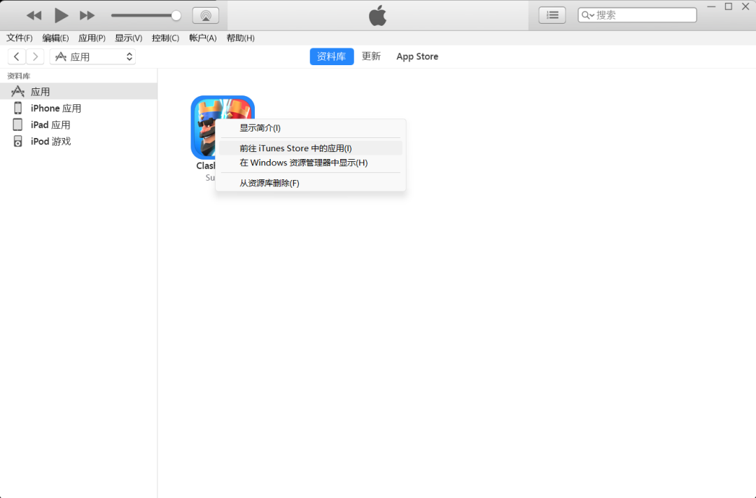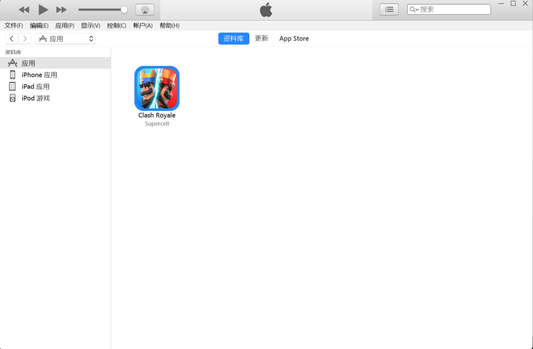 下载完成后,点击iTunes界面上的“资料库”,就能看到皇室战争的安装包了。
