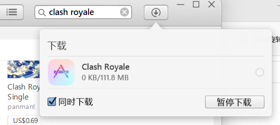 此时,这个版本的皇室战争就拦截成功了,现在切换到iTunes刚才的搜索结果页面,点击皇室战争图标下的"下载”。右上角的下载图标出现就表示开始下载了,耐心等待到下载成功,如果失败可以多重试几次。