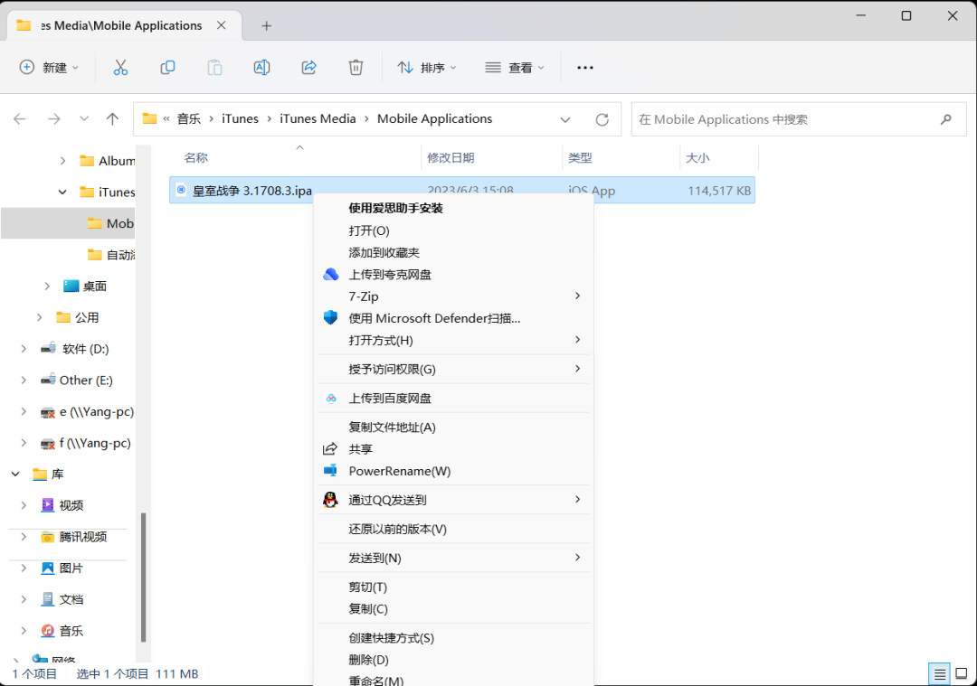 右键点击安装包,点击“在 Windows 资源管理器中显示”,跳转到Windows资源管理器,这就是我们需要的 3.1708.3 版本的安装包,右键安装包,选择使用爱思助手安装。