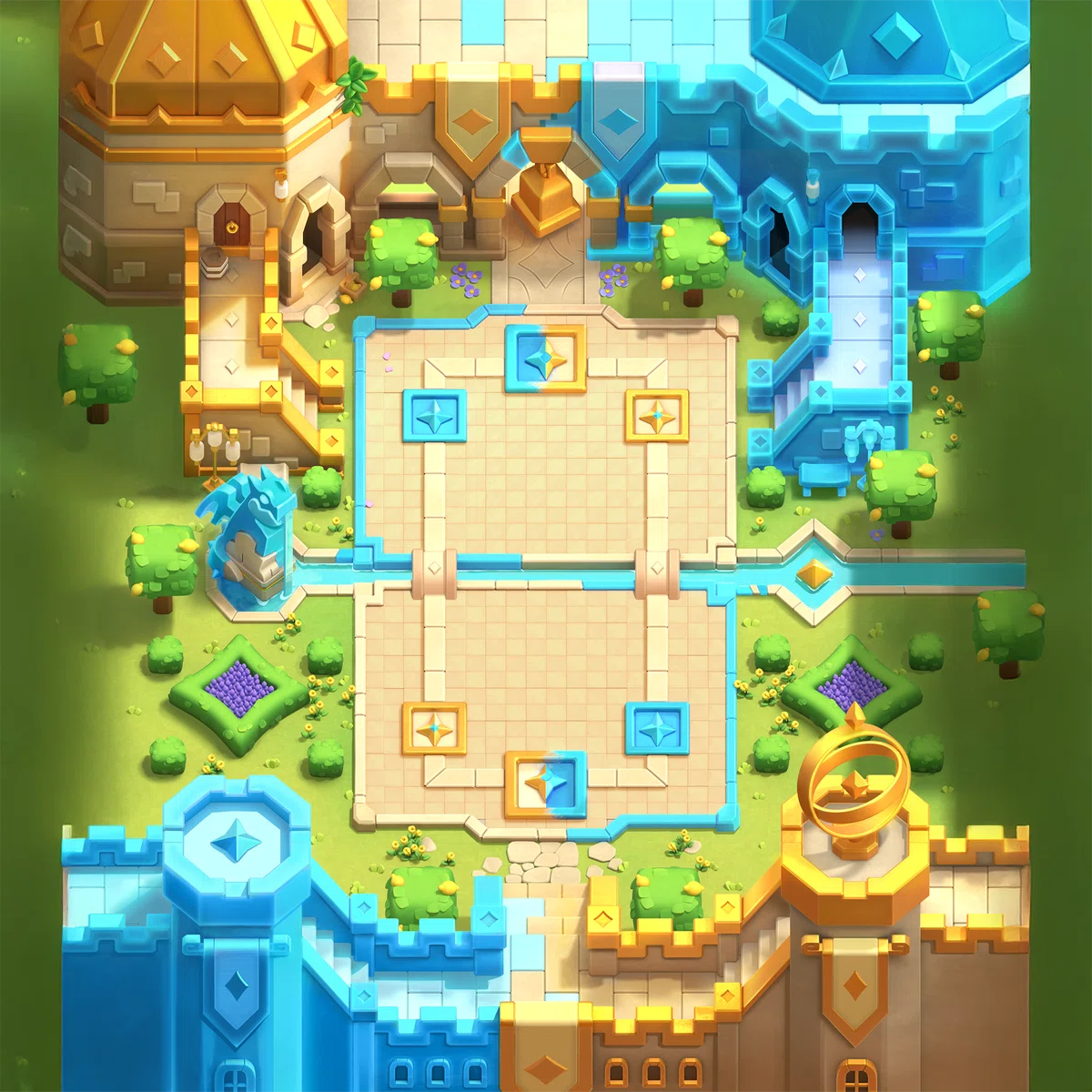 本赛季的全新竞技场风格独特!“精灵女皇”竞技场拥有独特的布景:竞技场一半为金色,象征着力量与皇室威严;另一半为蓝色,唤起精神的宁静。巨龙雕像、精致的建筑以及震撼的视觉效果,让战场焕然一新。